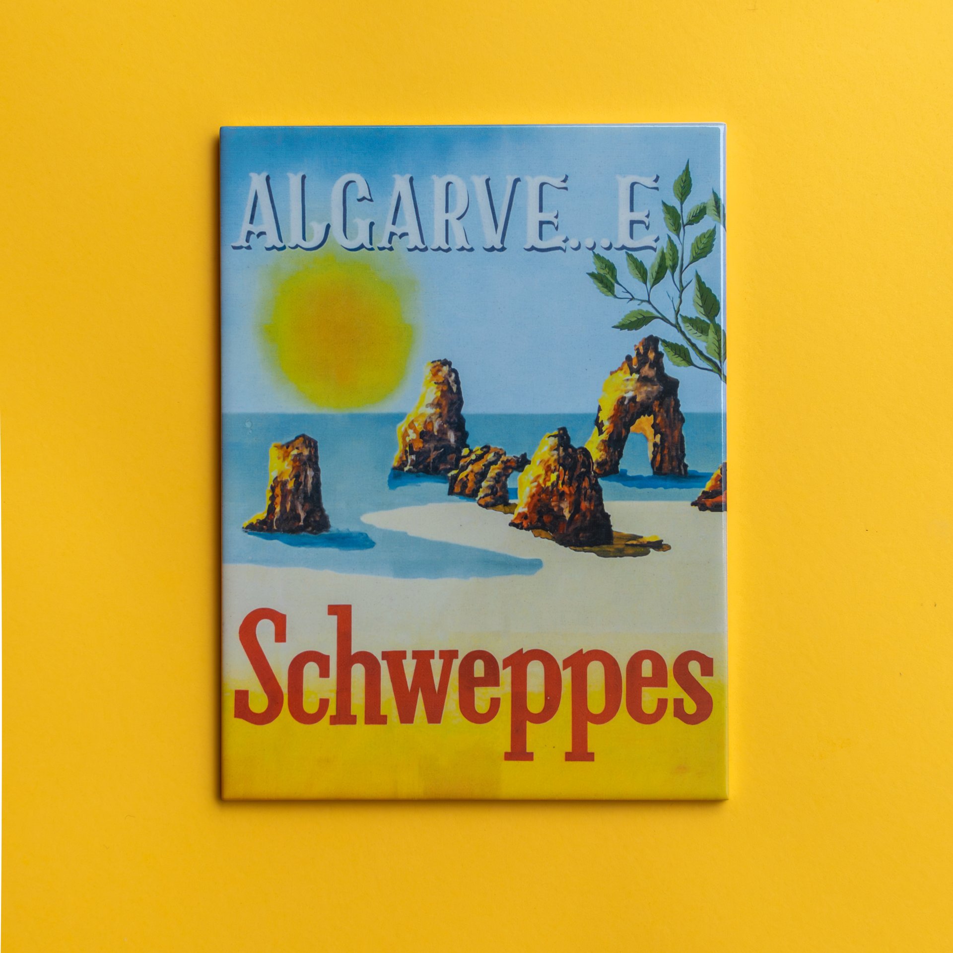 Azulejo vidriado de 20x15 cm inspirado en el azulejo publicitario “Algarve… e Schweppes”. Parte de la colección de mini-réplicas de azulejos publicitarios antiguos, todos con dimensiones similares.