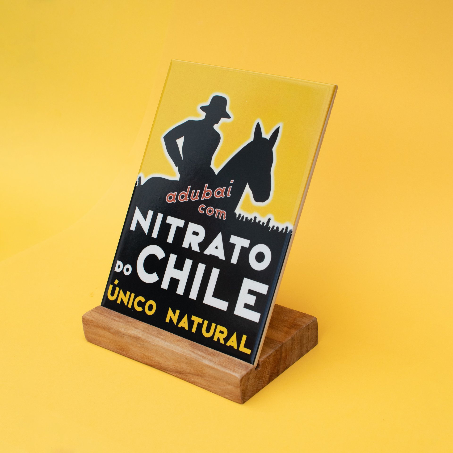 Azulejo vidrado de 20x15 cm inspirado no azulejo publicitário do Nitrato do Chile. Parte da coleção de mini-réplicas de azulejos publicitários antigos, todos com dimensões semelhantes.
